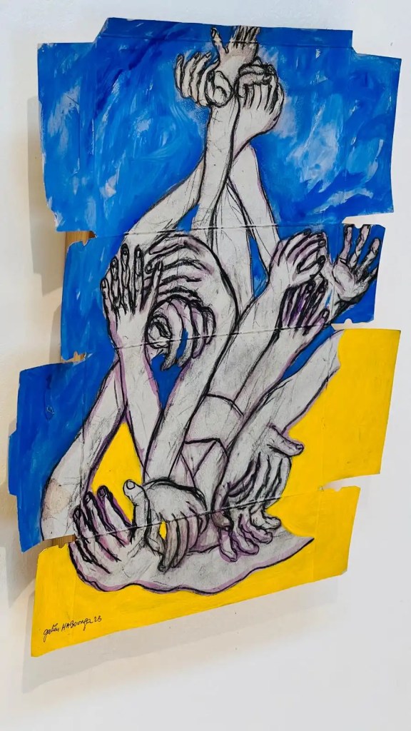Son exposition « SANS LES MAINS », présentée du 15 au 29 mai 2024 à la Maison des Arts de Bagneux, est un voyage entre fantasmes et réalité